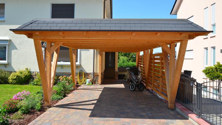 Schön geschützt: Unter einem Carport bringen Sie nicht nur Ihr Auto vor Regen, Schnee und Hagel in Sicherheit – dank des natürlichen Baustoffes Holz und der zahlreichen individuellen Gestaltungsmöglichkeiten kann er ein echter Hingucker sein. Ob einfacher Carport, Doppelcarport mit Geräteschuppen oder eine noch größere Variante: Wir konzipieren und realisieren für Sie eine Lösung, die in perfekter Harmonie zu ihrem Wohngebäude steht.